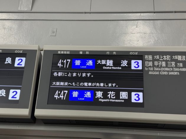 4時17分 普通 大阪難波行きに乗って布施に行きます(布施、上本町、難波、尼崎、甲子園、三宮とあるように布施はメジャー)