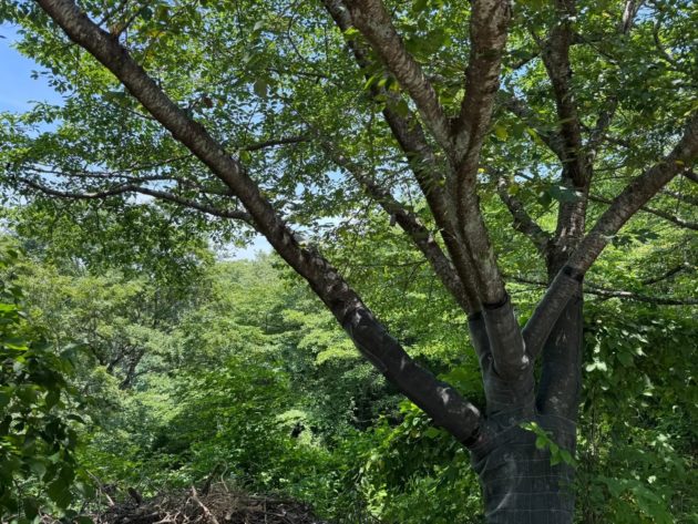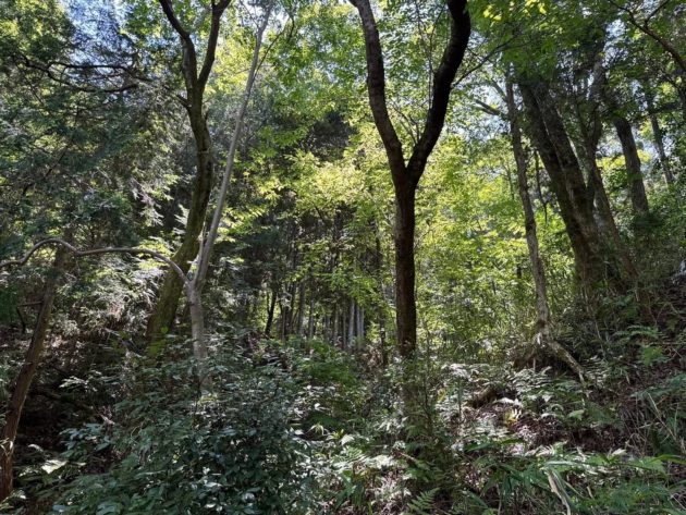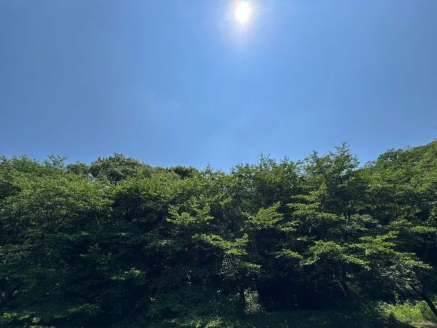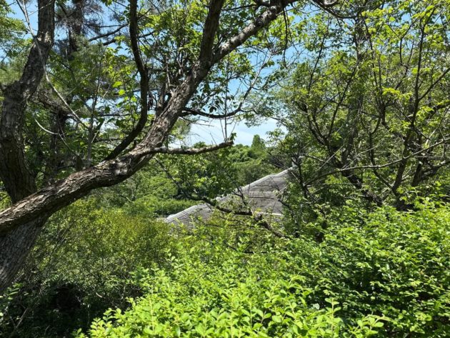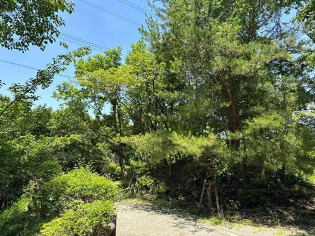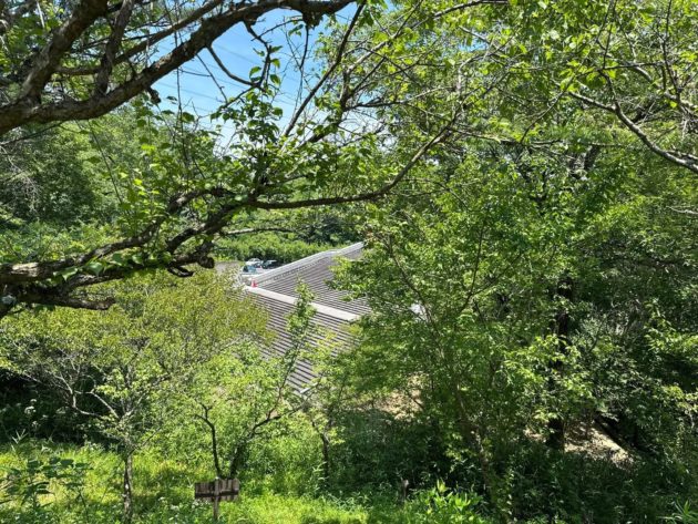 緑の隙間から建物の屋根っぽいのが見えてあそこっぽい