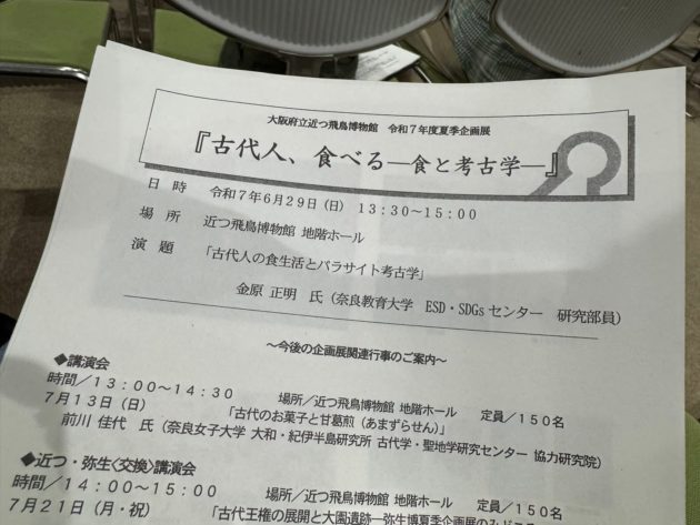 令和7年度夏季企画展「古代人、食べる」が開催中で講演会「古代人の食生活とパラサイト考古学」金原正明 氏(奈良教育大学ESD・SDGsセンター研究部員)に行って来ました。