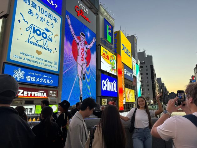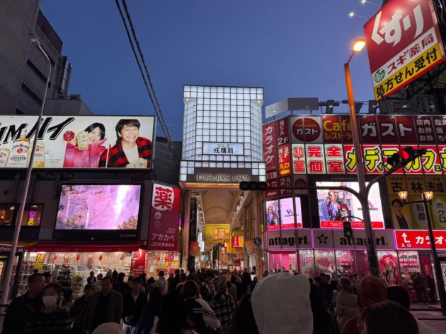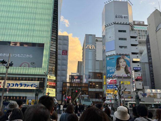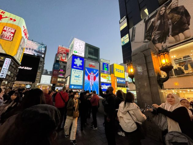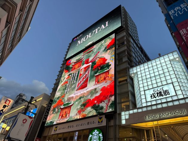 なんば戎橋筋の大看板には、中国語でお酒の広告。
