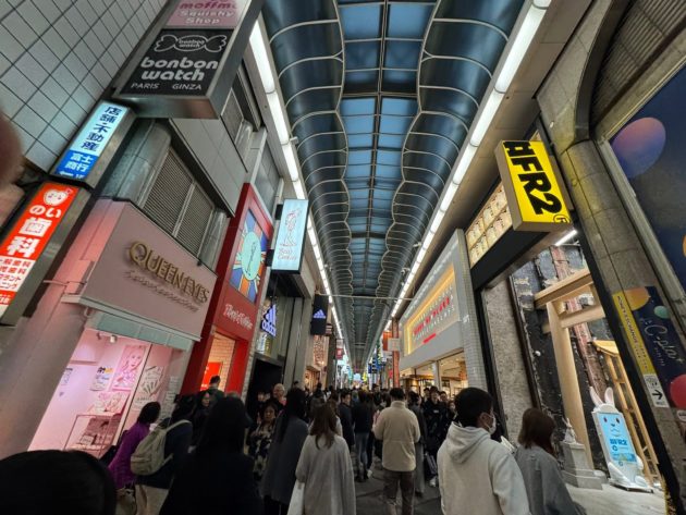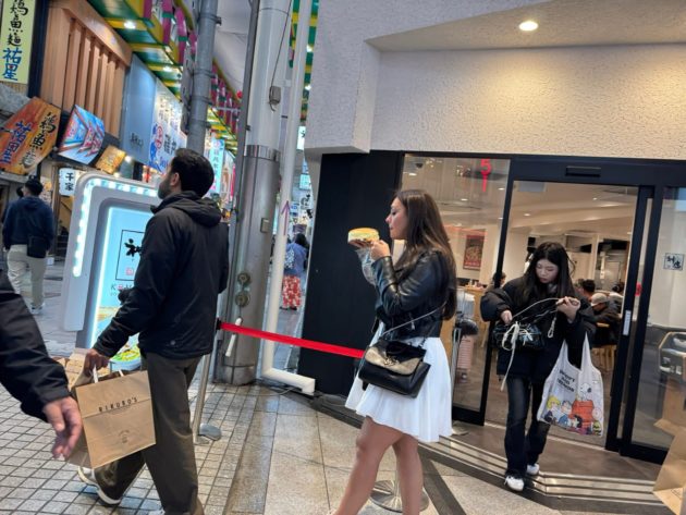 いつも大行列の「りくろーおじさん」なんば本店で買ったばかりのチーズケーキにパクつく外国人女性