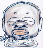 去年の「フォーラム顔学2006」でもサインペンで似顔絵を描くPICASSOの実演はあったのですが、今年は似顔絵ロボットPICASSO-2になって、筆ペンでサラサラと似顔絵を描くようになり、絵に味が出ました。