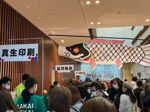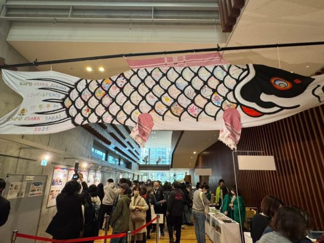 全長 5 メートルを超える手描きの堺五月鯉幟を活用して万博会場来場者と制作したオリジナル鯉幟を5月8日から5月下旬までヨルダンパビリオン正面入口上部に掲げていたそうです。