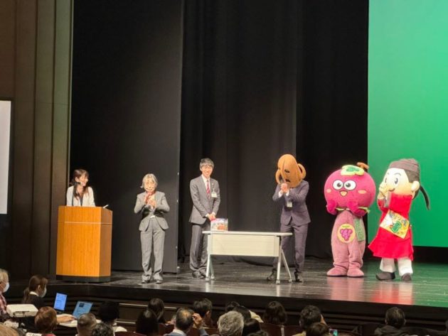 登壇者の記念撮影 ゆるキャラが後ろに・・・(見えるように並べればいいのに)