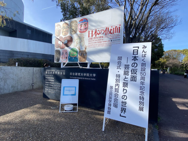 この貴重な機会に東京からも名だたるメーキャップアーティストや彫り師が話を聞きに来ていたのだが、終了後、彫り師が「仮面」と書かれた印刷物を持っていたのが今回の物語の始まり。声をかけたところ「そこにありました」と言われ、会場外のフライヤー置き場で国立民族学博物館50周年記念特別展「日本の仮面――芸能と祭りの世界」のチラシを手にした。