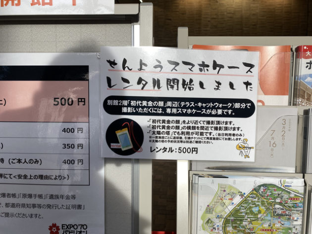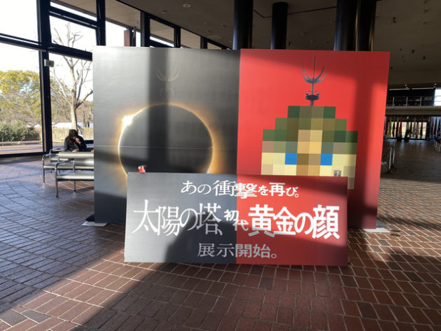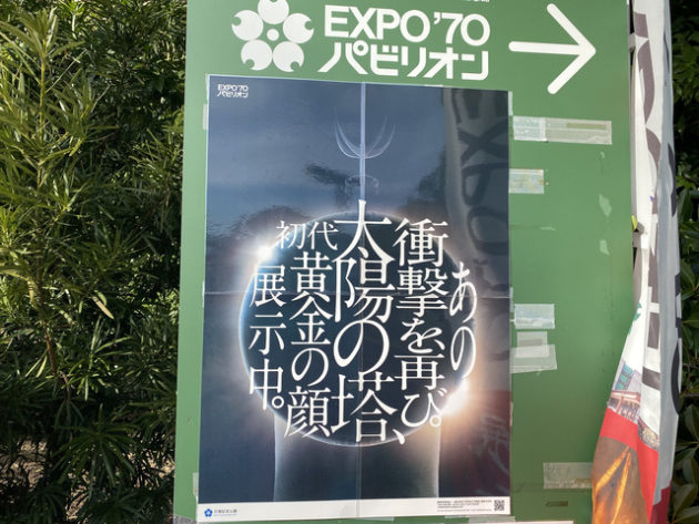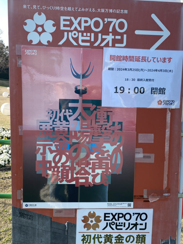 そこであるポスターが目に止まった。「EXPO’70 パビリオン→ あの衝撃を再び。初代太陽の塔、黄金の顔展示中。」さらにその上に4月3日まで「開館時間延長しています 19:00閉館」。