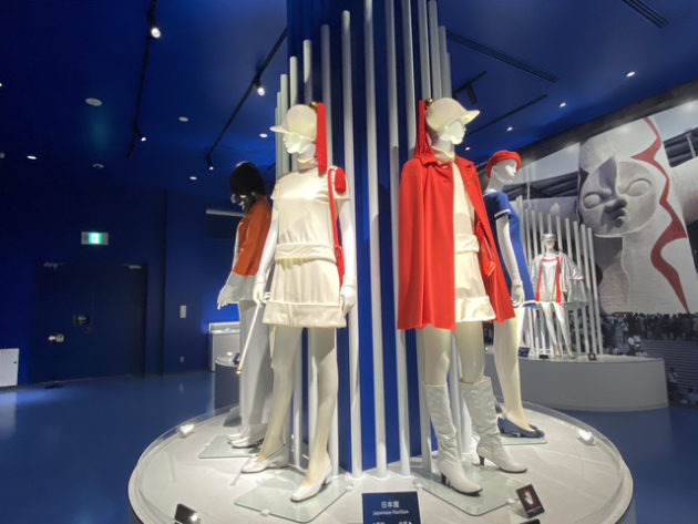 各国パビリオンのホステスと呼ばれた女性たちのユニフォーム。日本館の紅白を基調とした美しいデザイン。