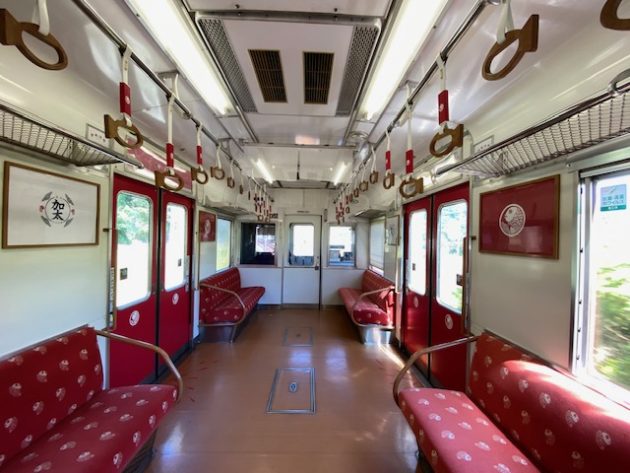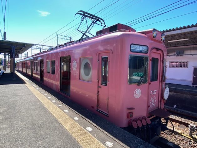 加太さかな線観光列車「めでたいでんしゃ」ピンクのさちで、加太駅から1駅隣の磯ノ浦駅へ。