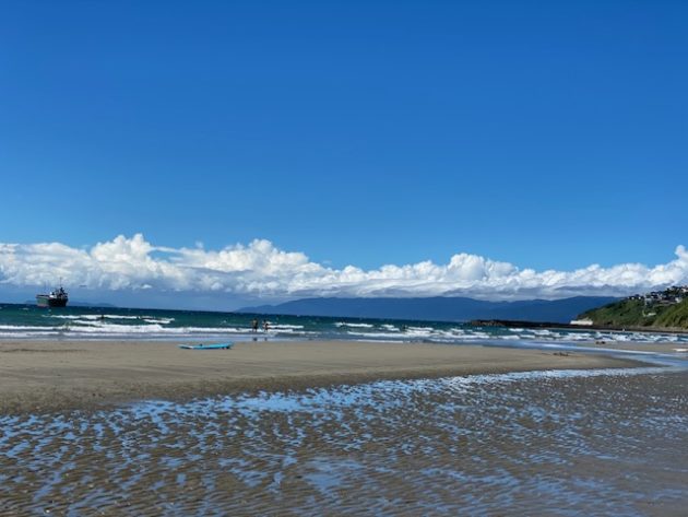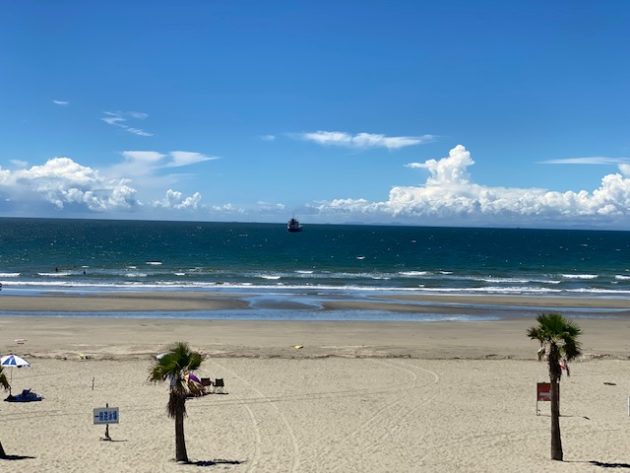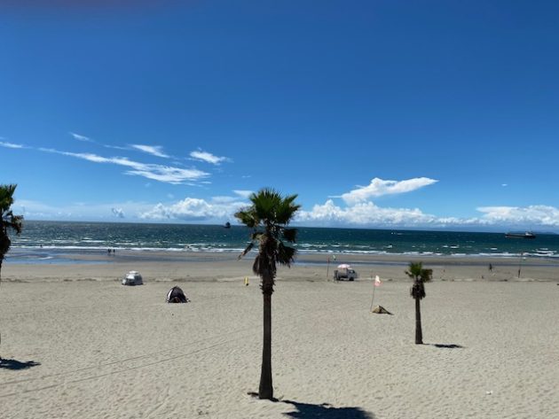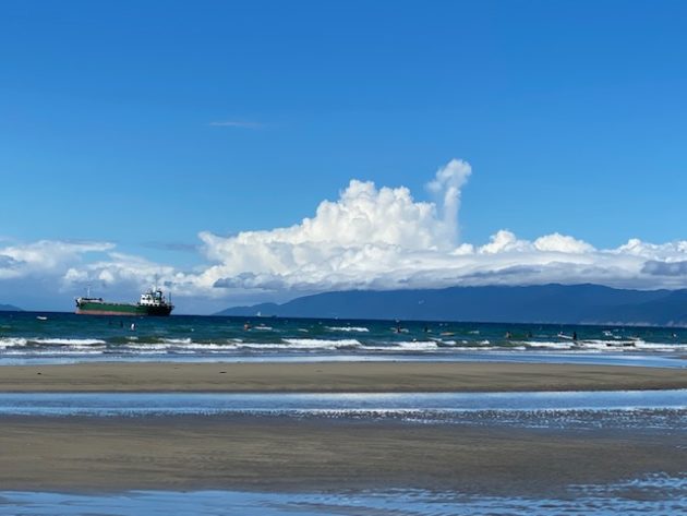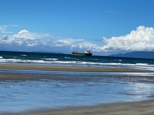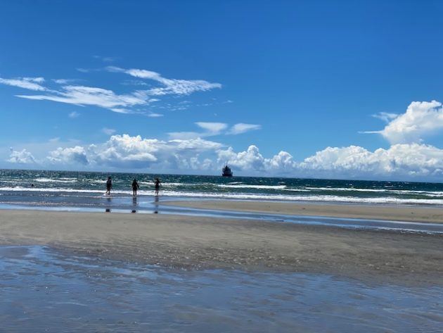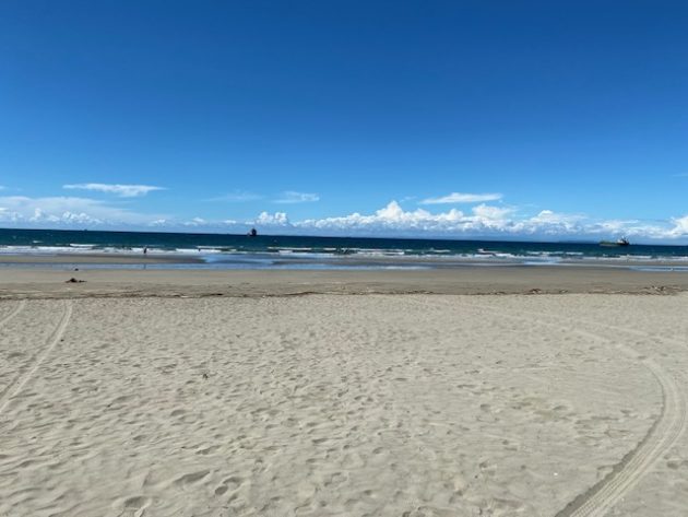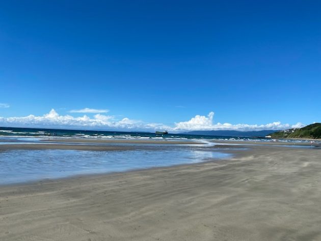 こんな立派なビーチに全然人がいない。なぜか前方に大きな船が止まってる。
