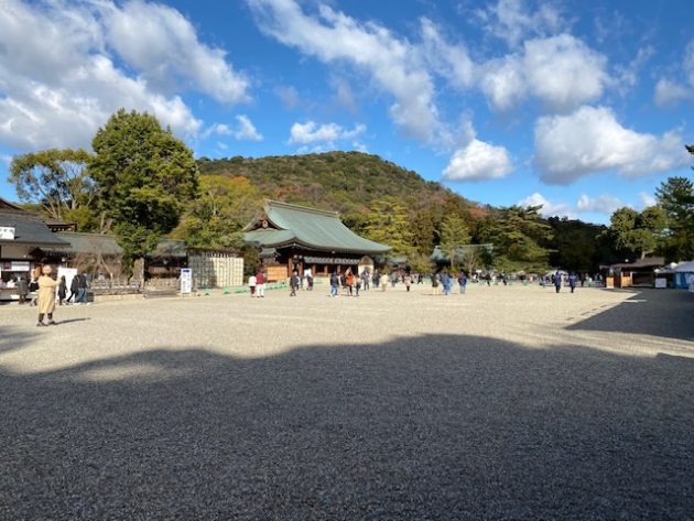 どうでしょう、この青空と雲と畝傍山と外拝殿、白い砂利、そして影が調和した美しさ。
