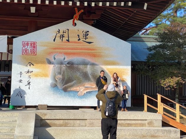 橿原市在住の日本画家・藤本静宏さんが描いた丑の大開運絵馬(高さ4.5m・幅5.4m)