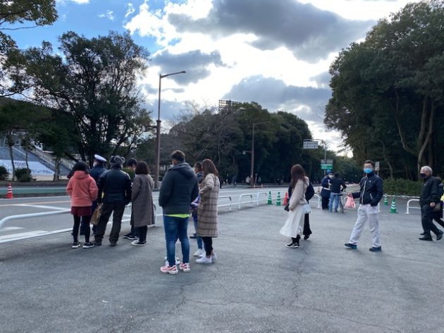 三角コーンよって「参拝入口」と「参拝出口」が仕切られています。