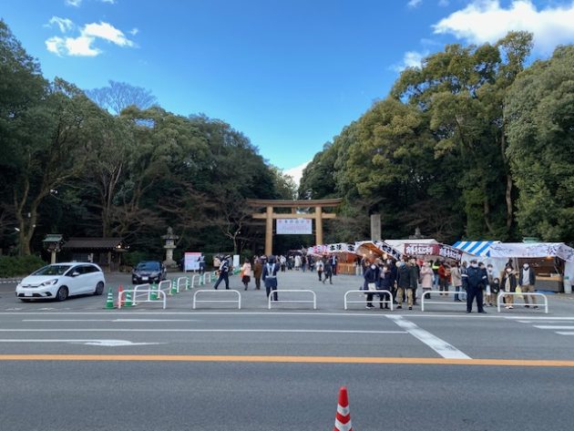 第一鳥居をくぐって表参道に入るといつもは参道の両脇にある出店が参道のさらに外側の道に。