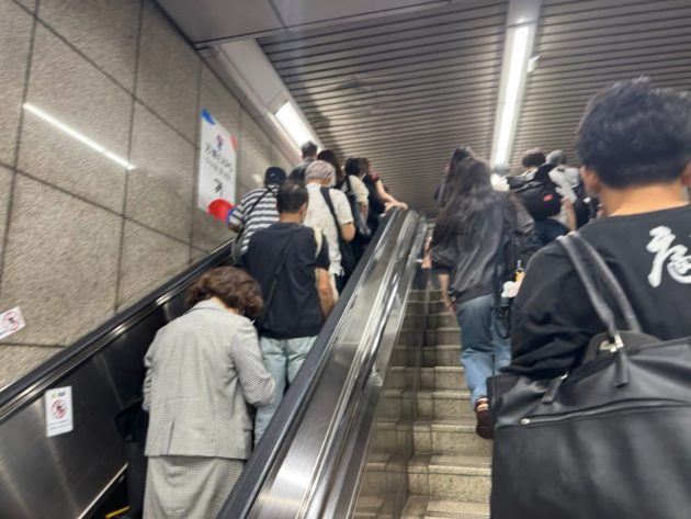 エスカレーターで改札階に上るのも大変な人混みで大混雑。改札口へも足踏み状態