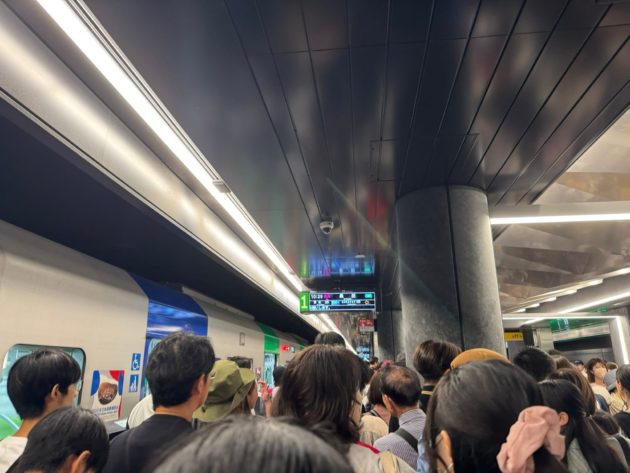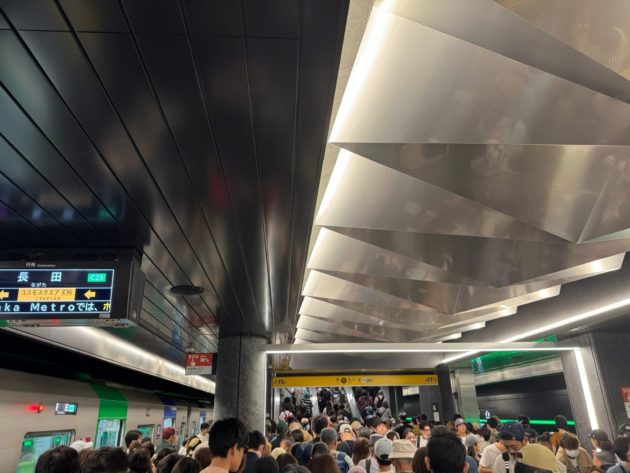 御堂筋線は通勤ラッシュを終えた10時台でも満員電車。中国の大型連休「国慶節」が、今年は10月1日から8日までの8連休ということで、中国人観光客も多かったのでしょう。