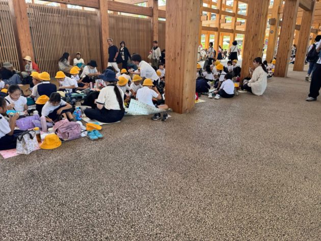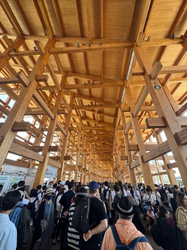 休んでる間も7月と違って27度でも涼しく感じた。すでに大屋根リングの下のベンチは埋まっていたので、私がベンチから立ったタイミングで食べ物と飲み物を持った人が座る。
