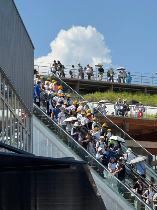 大屋根リングに上っていく黄色い帽子の小学生たち