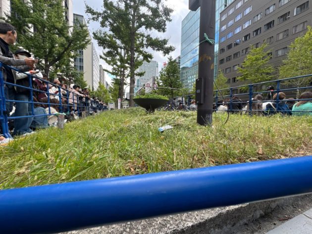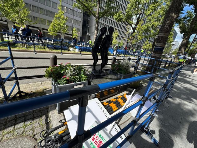 こんな感じで柵でブロックごとに仕切られている。そして、御堂筋名物の沿道のアートも保護。