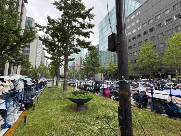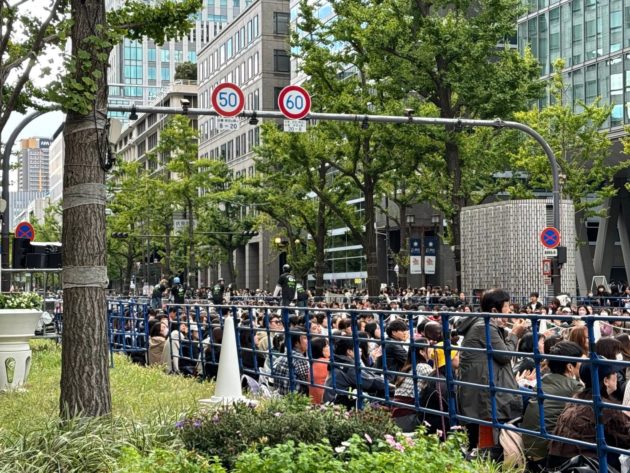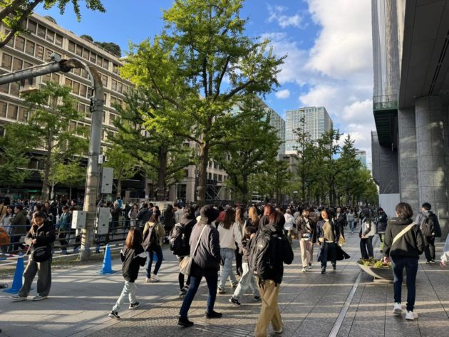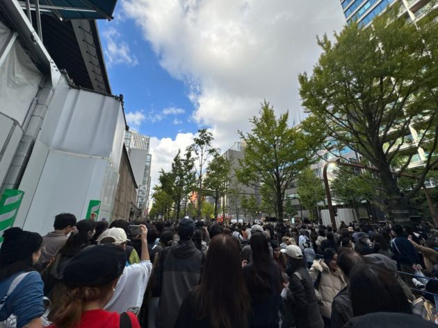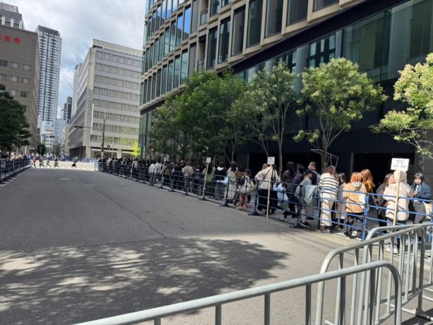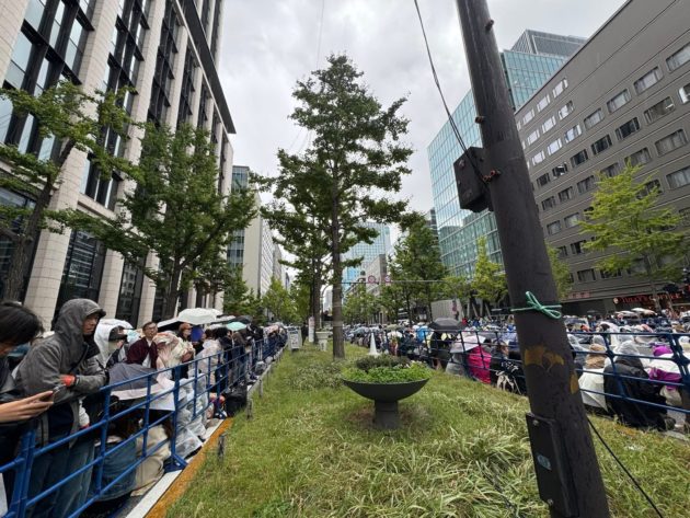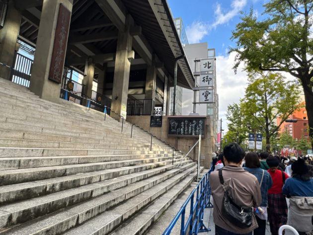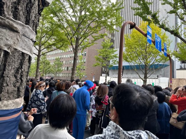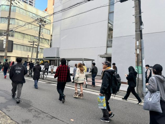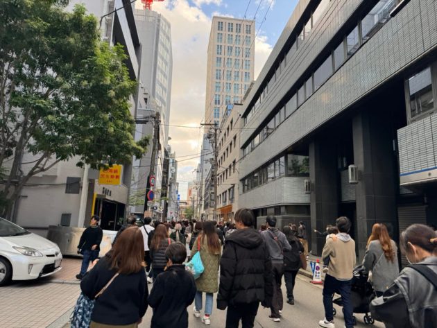 御堂筋から1本外の道に入るとこのような入場待機列。外国人のほうが多い難波・心斎橋と違って日本人ばかり