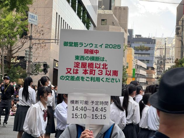 御堂筋ランウェイ開催中は横断ができない。(間に5分間2回の横断可能時間が)