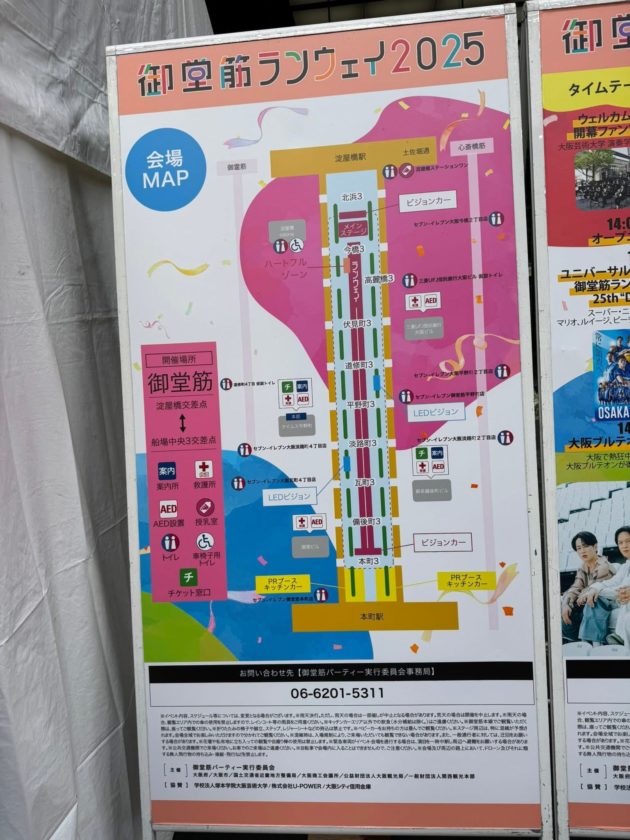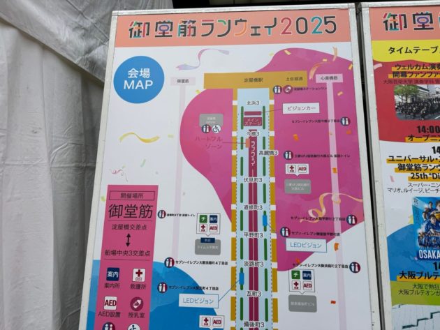 淀屋橋駅から本町駅まで1駅分、約1.1キロメートルの超長いランウェイ。私は比較的ステージから近い北から3ブロック目(10のブロックが東西でQまである)のFブロック側道に当選。。集合は伏見町3交差点東側だったので淀屋橋駅で降りた。