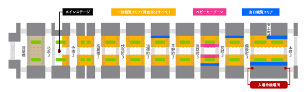 私はランウェイ前のエリアから中央分離帯を挟んだ側道だったが、柵前の1列目は全部取られてしまい、Dブロックとの間の高麗橋3のステージとは逆の南向きの(本町向き)の柵にもたれかかる柵前にポジションと取った。