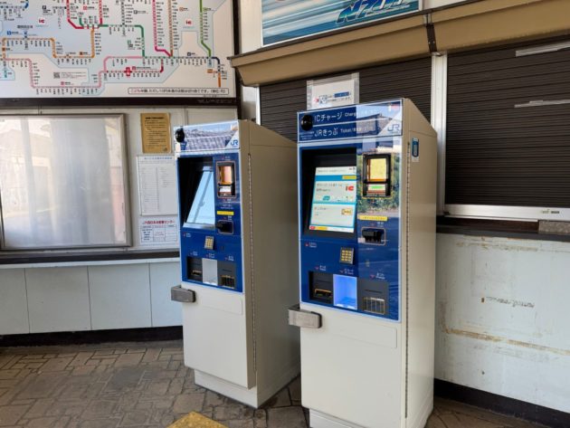 JR三輪駅は無人駅。Suicaの残高が足りずもチャージする機械がない。改札の外に見えたので、一旦改札を抜けてチャージし、また戻ってタッチして運賃を支払いました。