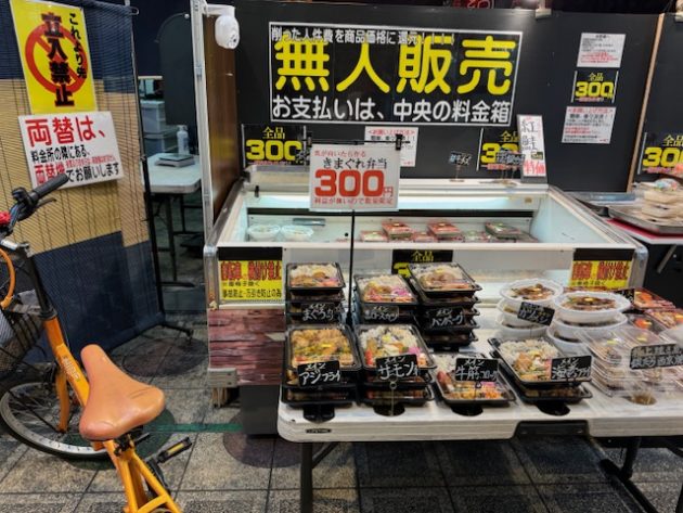 店の最寄駅は近鉄の針中野駅で徒歩4分だが、今回も日本一地域に密着した「駒川商店街」を大阪メトロ谷町線の駒川中野駅から南下してのんびり歩くことにした。無人販売の惣菜屋には「気まぐれ弁当 300円」が並ぶ。