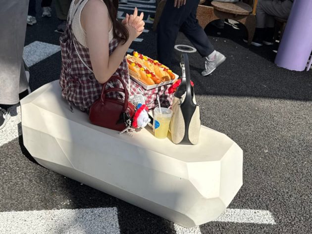カフェも行列 女性が手に持ったオレンジ色の円形のは、びよーんと伸びて椅子になる。
