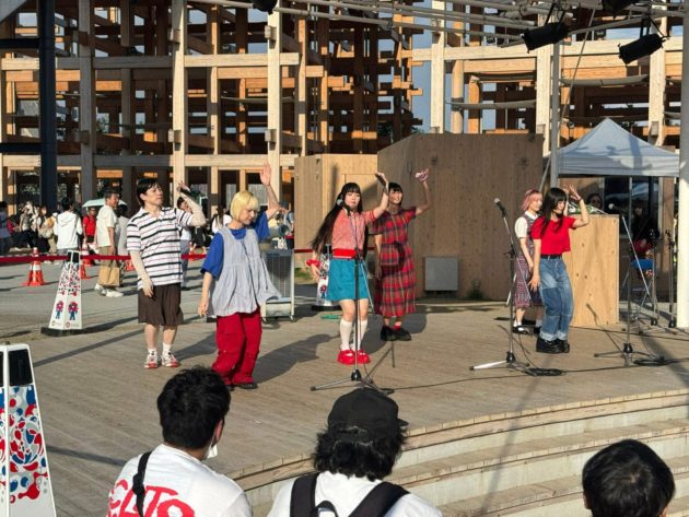 よしもと興業パビリオンの前は影が出来ていて座って休める休憩所に