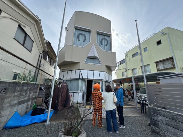 打ち合わせをするスタッフの後ろ姿と、道路からは裏側にあるシャレコーベミュージアムの顔面(外顔)