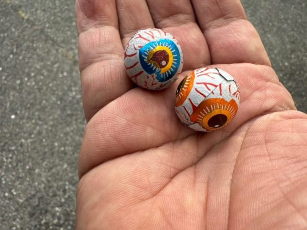 全体的にクオリティが高い仮装の女性がいるも「ガイコツアイテムがゼロで惜しい」となったところで、私がスマホについているクロミちゃんのキーホルダーを見つけ、「いや、ありました!」と指摘してよく見てみたところ「ミャクミャク」になりきったサンリオキャラクターグッズのクロミで、ちょうど額のドクロところがミャクミャクの目のもこもこになってました(それもただのサンリオ万博コラボグッズではなく、人気の黒ミャクミャク)