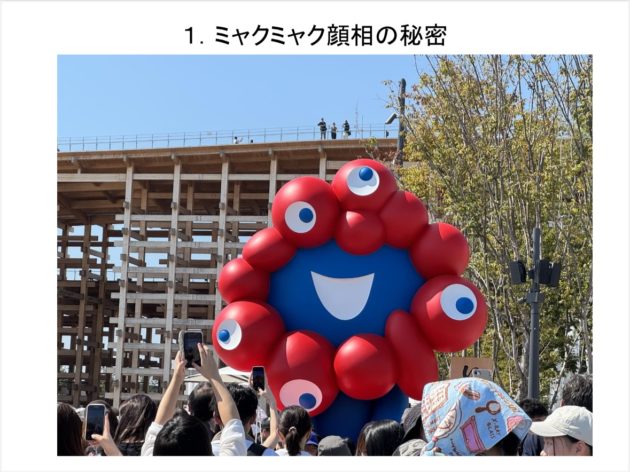 ミャクミャクの顔相はここで書いている内容に加えて、なぜ、ミャクミャクが人気キャラクラーになったのかを詳しく解説しました。