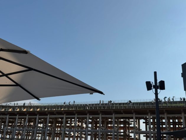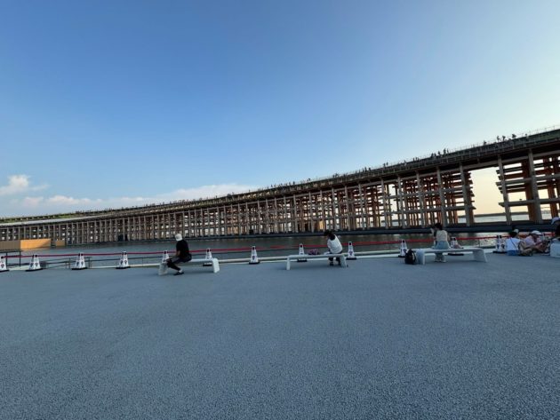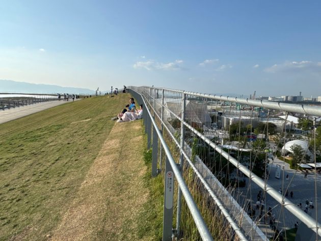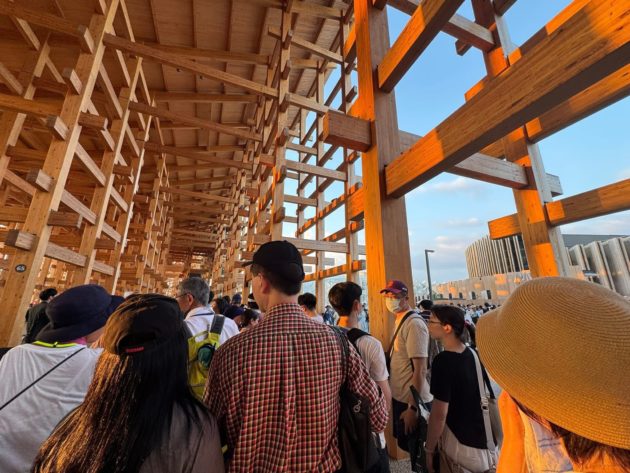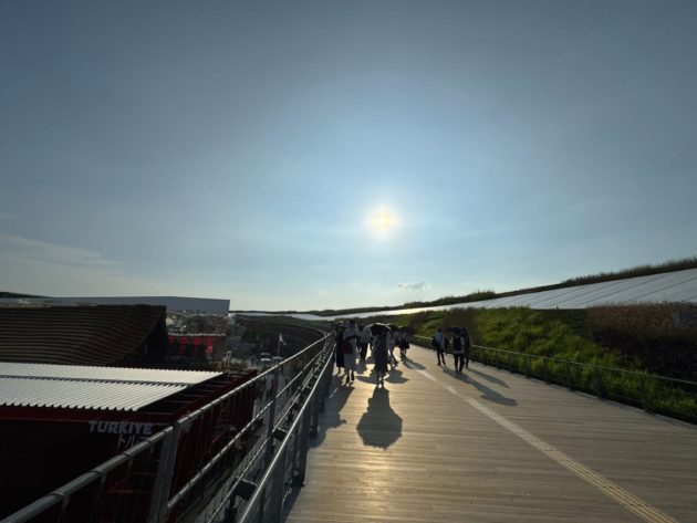 夕方になってもめちゃめちゃ暑い万博会場の大屋根リング。まあ、直射日光直浴びですし。