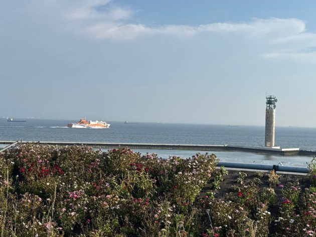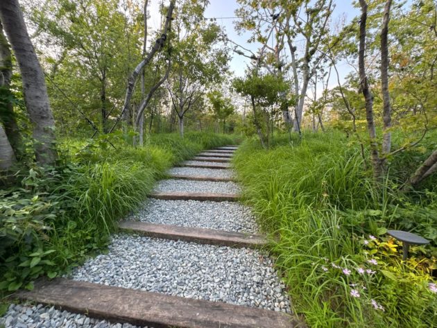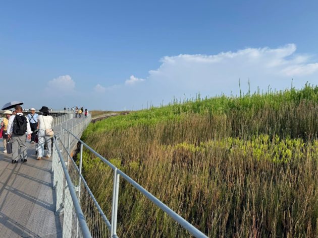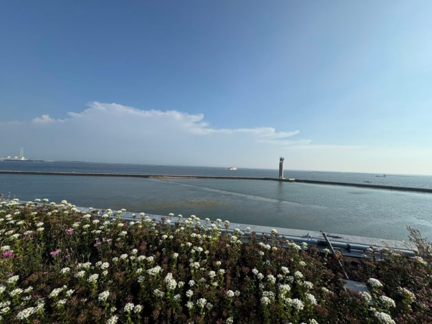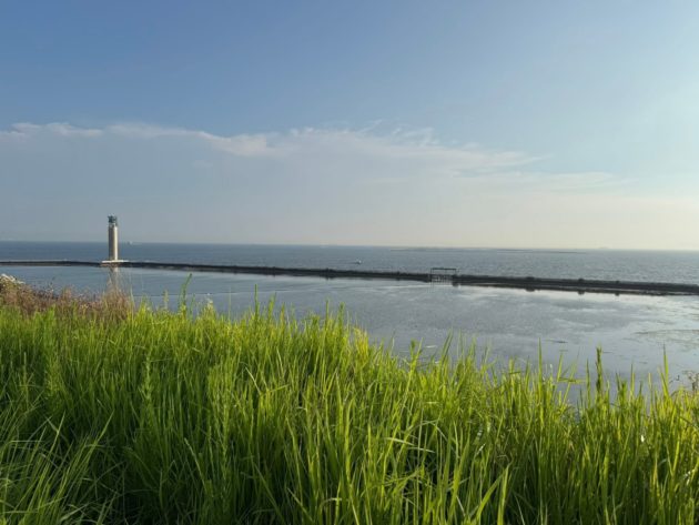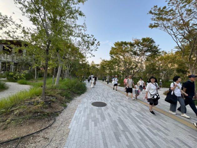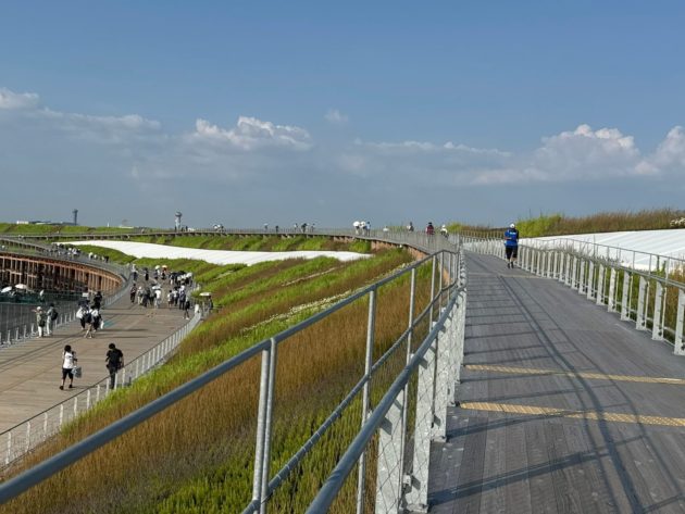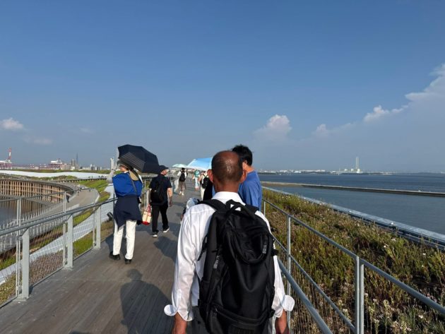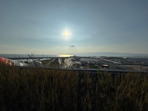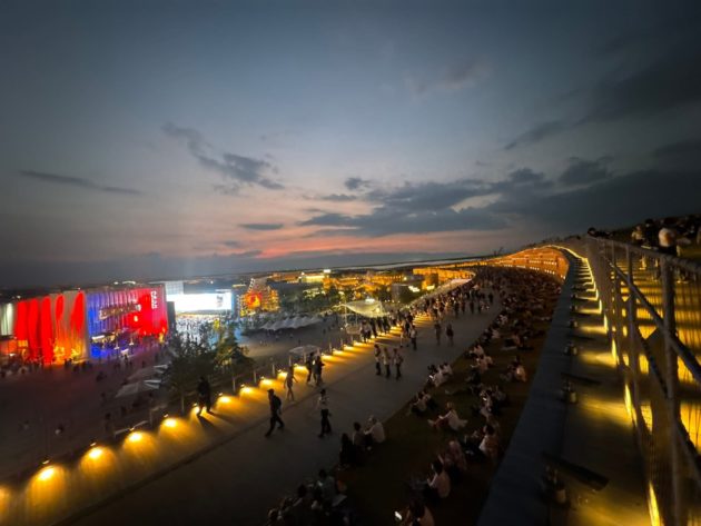 海に浮かぶ島「人工島」の夢洲。どこから来たのか大屋根リングの上側の花壇というか草むらでまだ明るい17時過ぎにコオロギか何かの虫が鳴いていた。