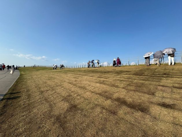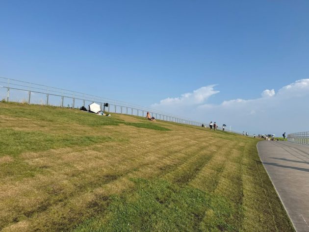 芝生に座ってただ風を感じる人達。「ここはてんしば?グラングリーン大阪うめきた公園?」。