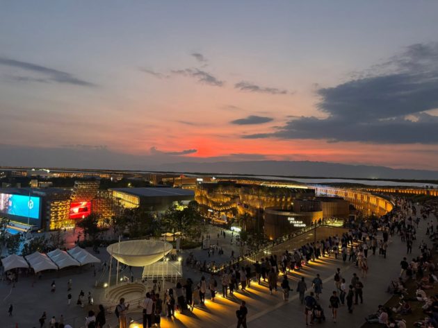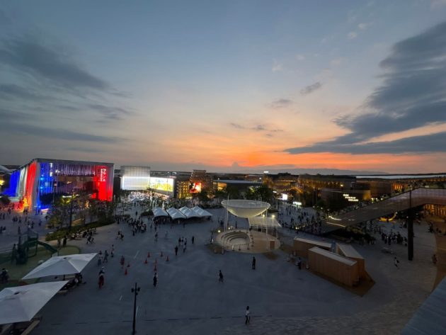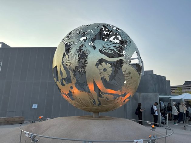 河森正治「いのちめぐる冒険:シグネチャーパビリオン」のオブジェも夕陽が反射して美しい!