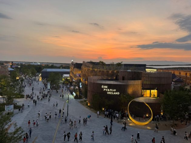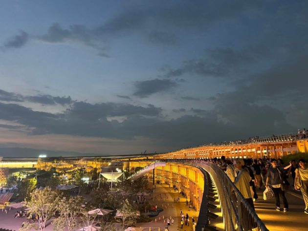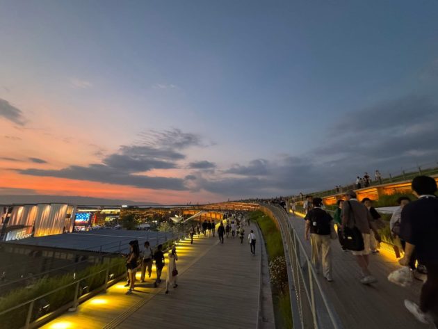 大屋根リングをぐるっと一周歩く。フランスパビリオンと六甲山に沈む夕陽が美しい