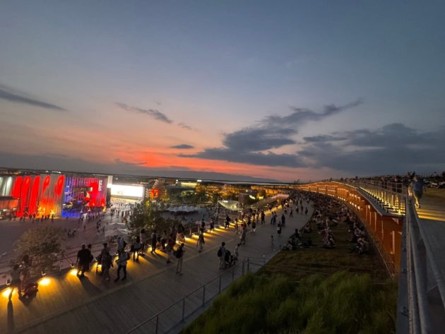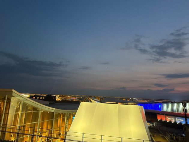 暗くなるとパビリオンにネオンが照らされ、特にフランスパビリオンは赤、白、青と変化して美しかった🇫🇷