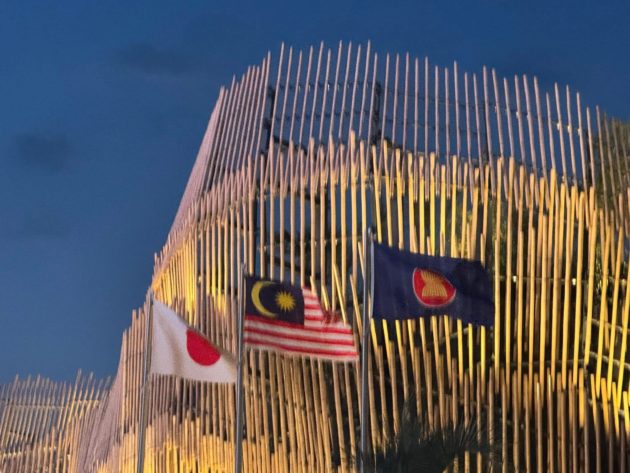 日本国旗とマレーシア国旗、もう一つはよくわからない。