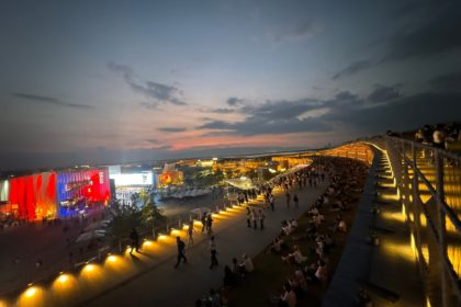 大屋根リングをぐるっと一周歩く。フランスパビリオンと六甲山に沈む夕陽が美しい