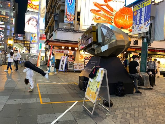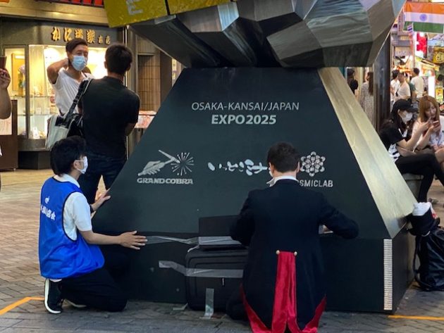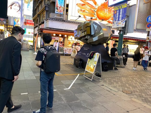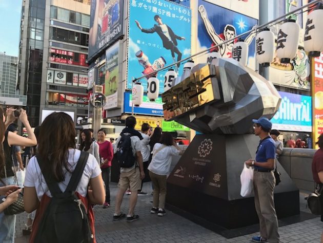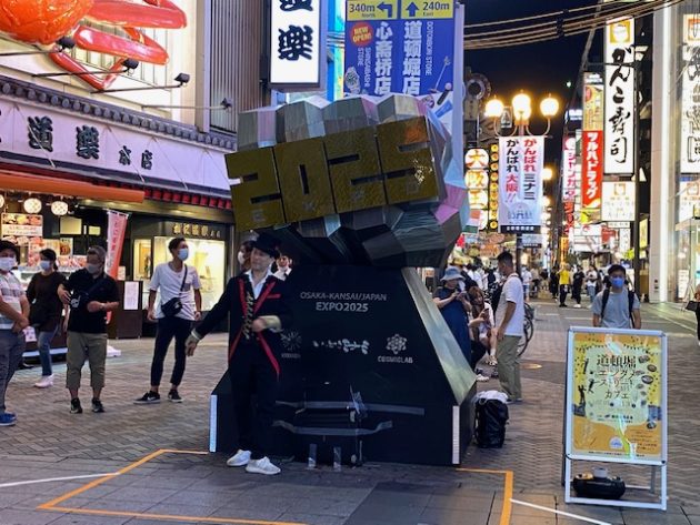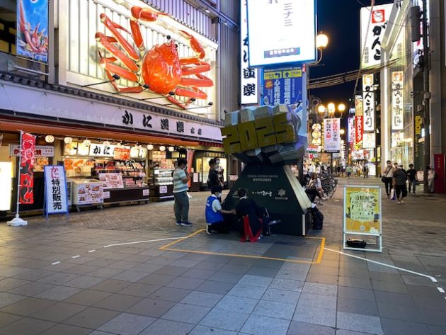 そして、その看板の下には、戎橋のグリコの看板と記念撮影するのに邪魔でしょうがなかった、大阪・関西万博2025誘致用の「げんこつ」型のPRオブジェが移動されて設置してあり、なにやらやっている白シャツにマスクの男性が。