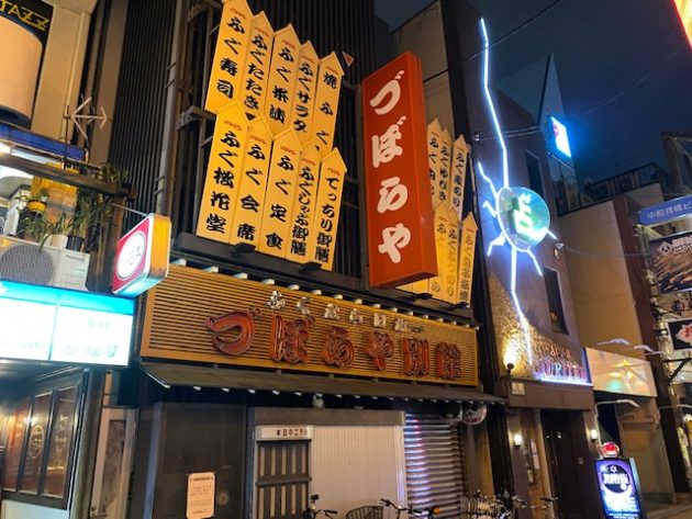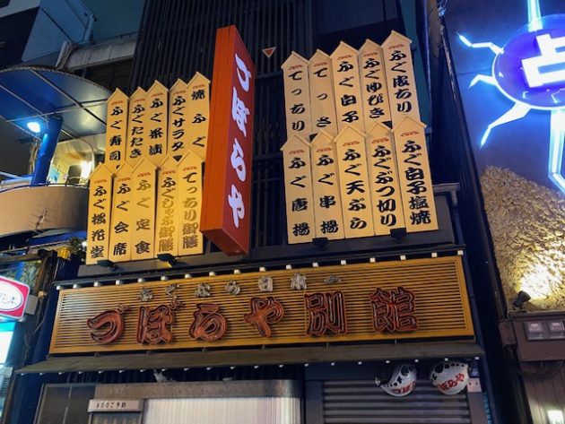 道頓堀の「づぼらや」も押さえておこうと「づぼらや別館」に行くと「ふぐ提灯」がない。
